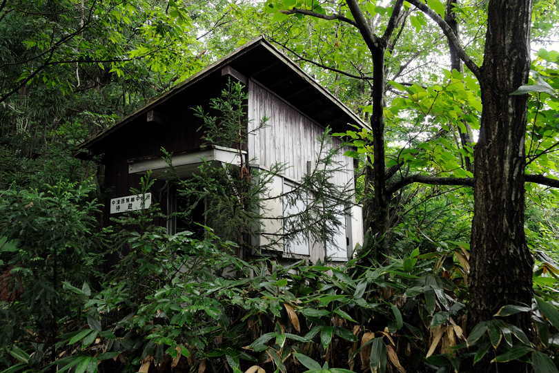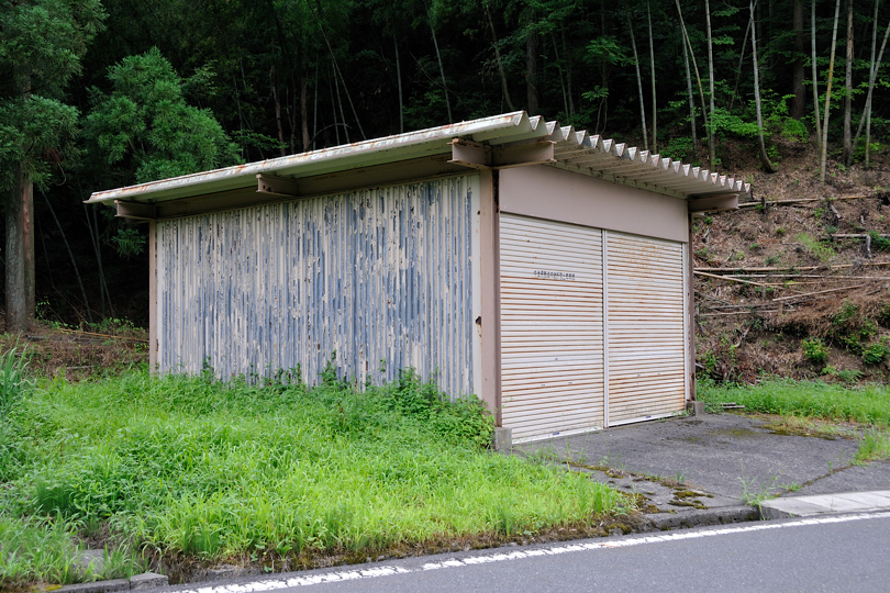 年季入った建物、シャッターには「中津原無線中継所雪上車車庫」の文字が・・・ どんだけ雪積もるんですかこの界隈・・・ 元々は電電公社の所有だったんだろうな。今はどうなってんだろう?