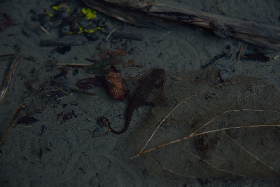 トンネル内部。道路部分は池の様相でイモリが住み着き、上部には亀裂が入っていた。
