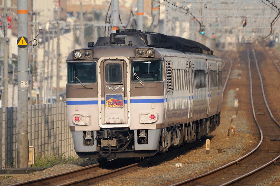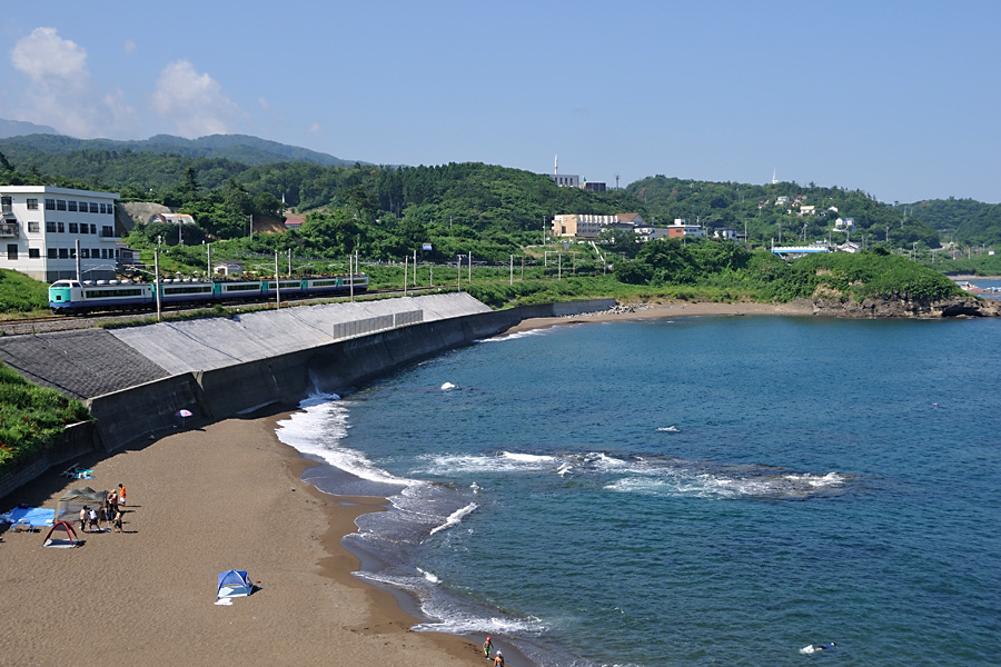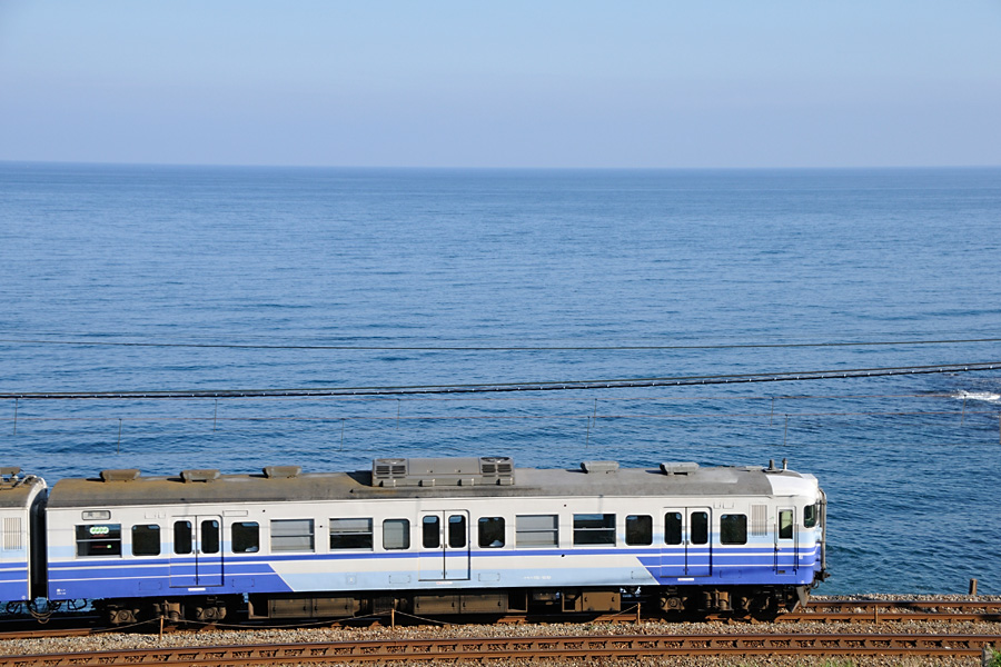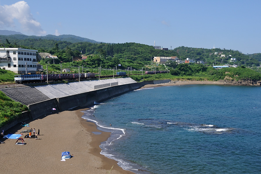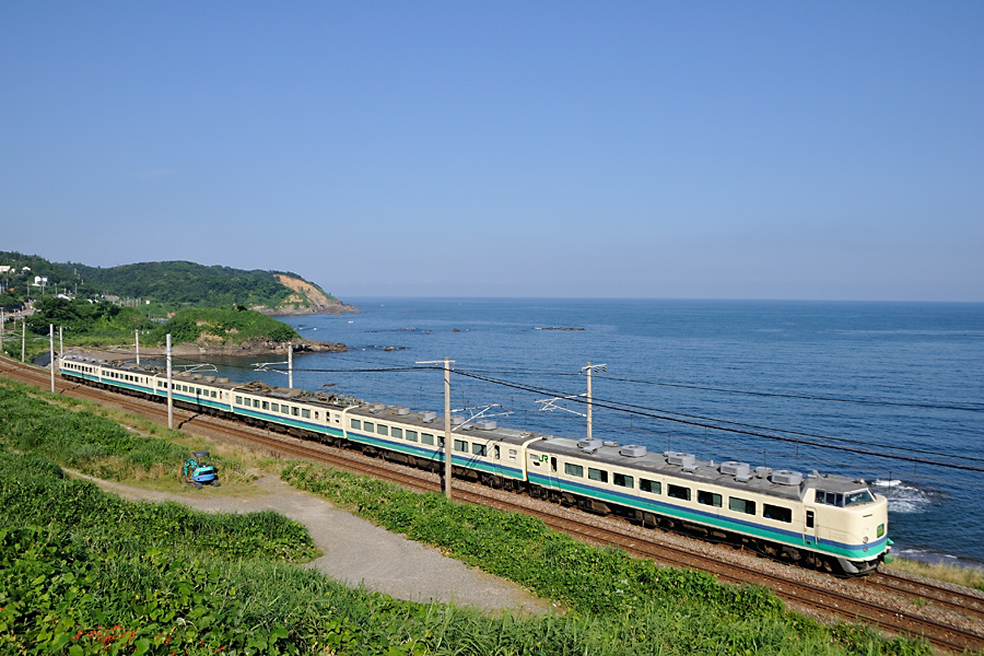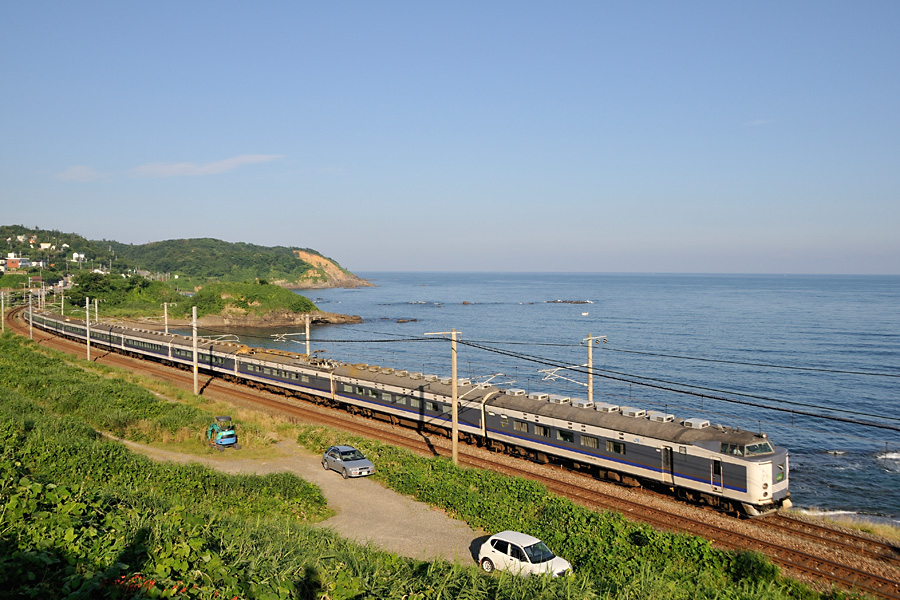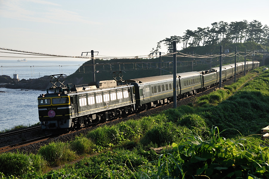 | 撮影ポイント2 夜勤明けで折り返し整備して鯨波に着いたのは18時20分頃。トワイライトエクスプレスは撮影ポイントへ移動中に通過してしまったが日の入りには間に合った。 フライデーナイトファンタジーといったところでしょうか。 |