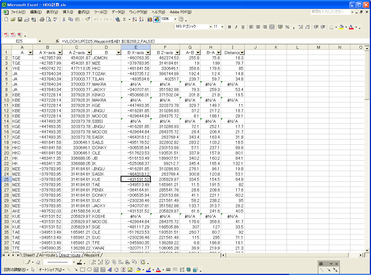 で、http://mrj501.blog.shinobi.jp/Entry/19/に距離計算を追加してチマチマと座標を入力しているときに思いついた。「.pointファイルをエクセルに取り込んで検索関数で名称入力だけで値が出てこないものか」と。